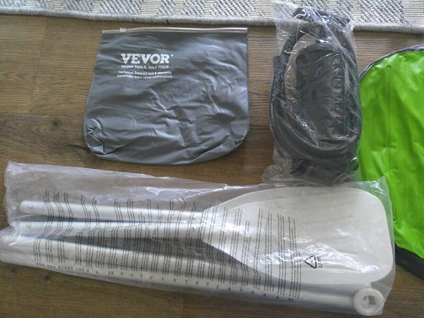 Das Schlauchboot wird mit einer Luftpumpe, einem 7 Meter langen Seil, einer Tragetasche und einem Reparaturset geliefert.